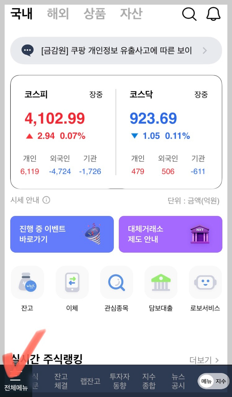 우선, 홈 화면에서 '전체메뉴' 에 들어간다.