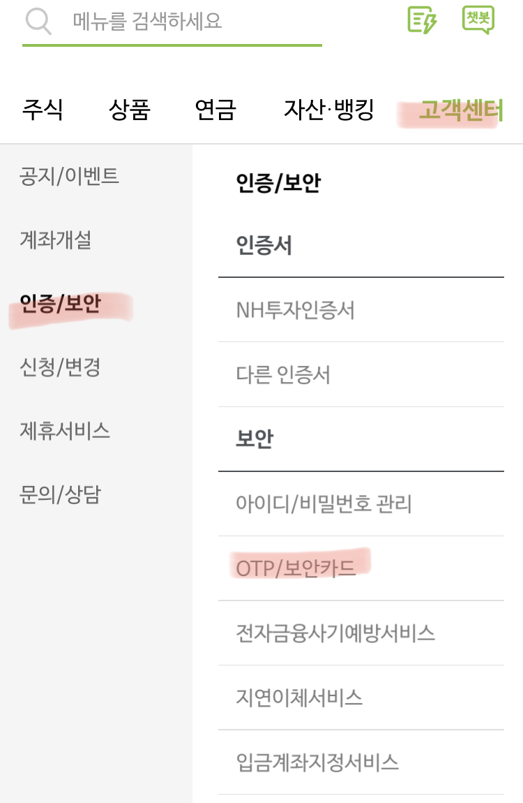 1. 고객센터-> 인증/보안-> otp/보안카드-> 모바일 OTP발급