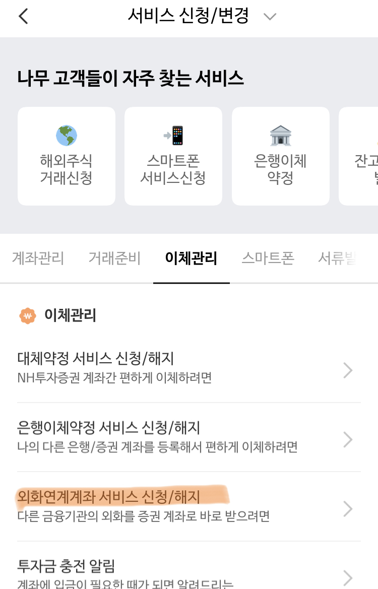 나무 증권에서는 외화계좌가 없어서 이것부터 만들어야 한다.