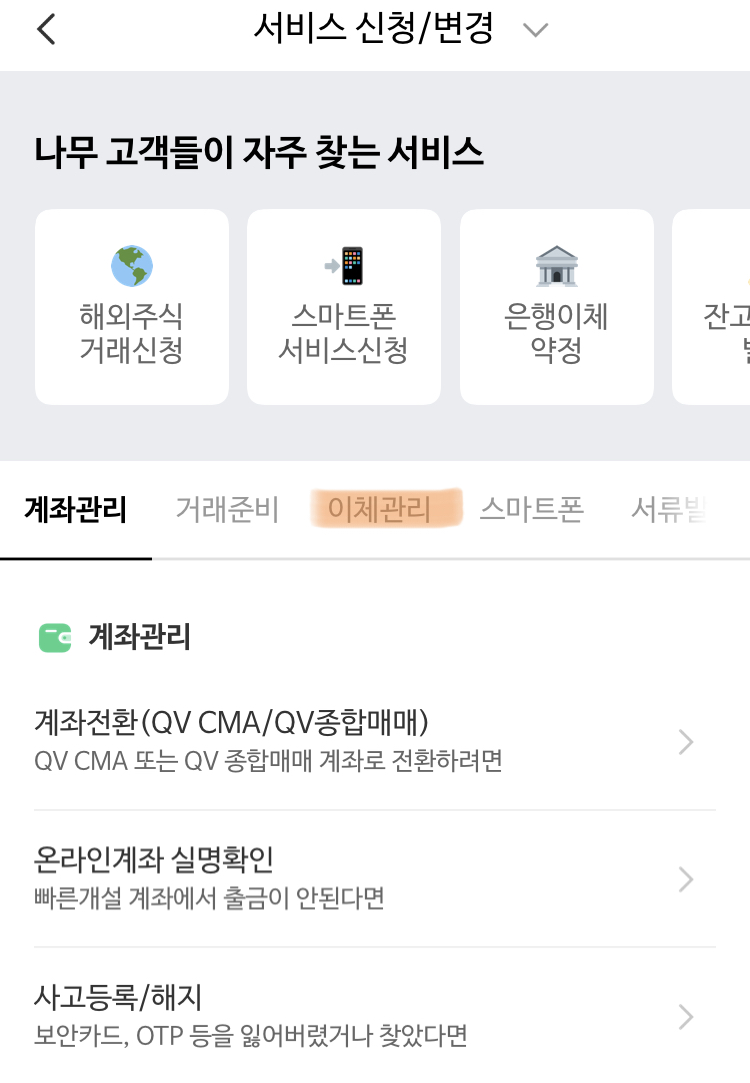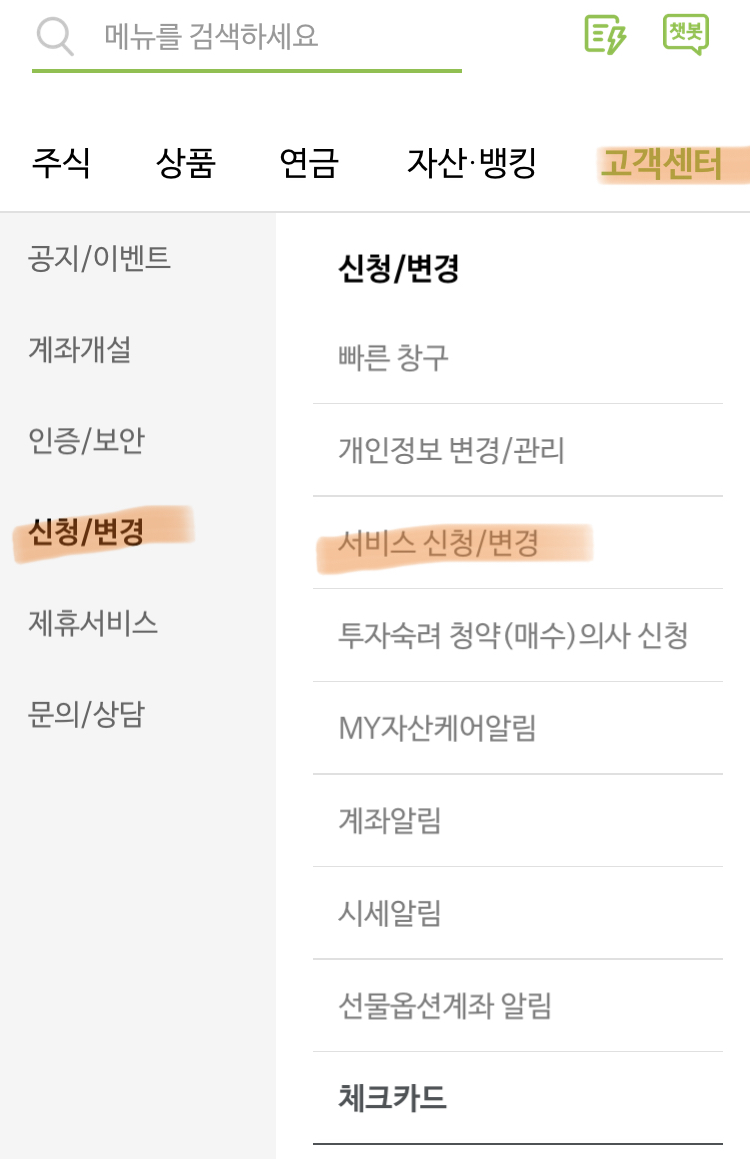1. 나무증권 로그인-> 고객센터-> 신청/변경-> 서비스 신청/변경