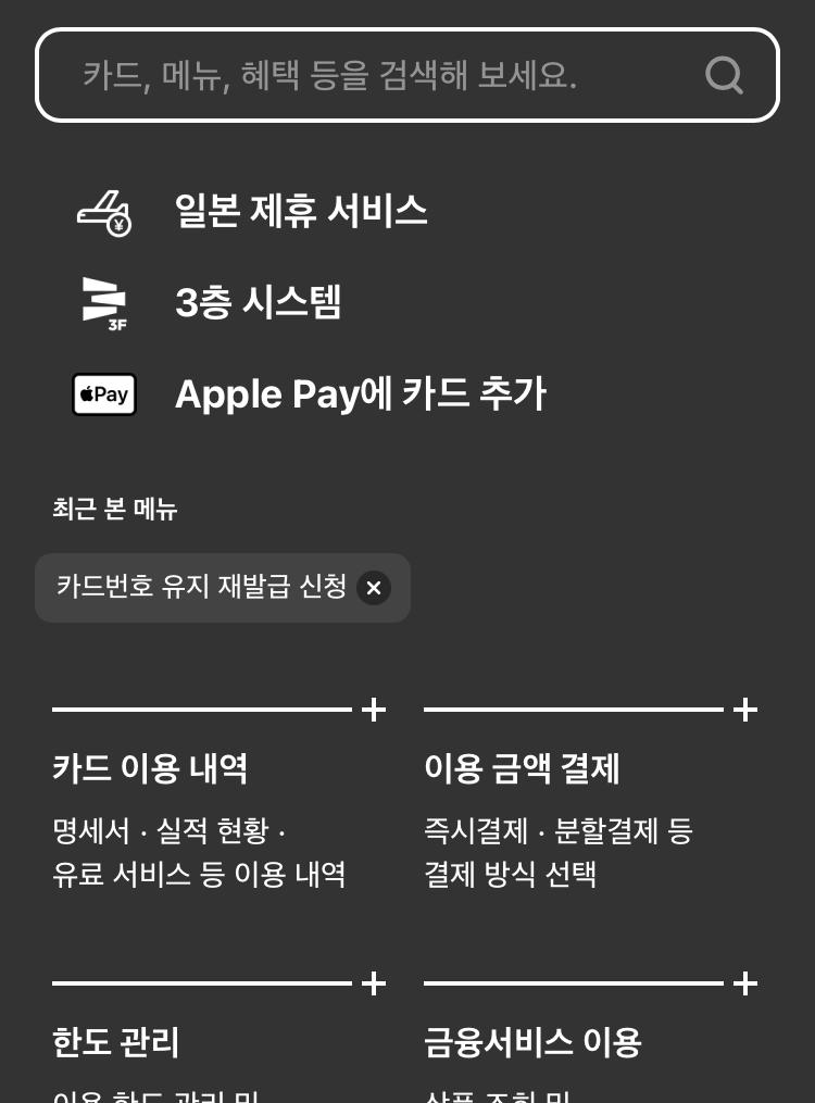 1. 현대카드 앱 켜서 검색창에 '카드번호 유지 재발급 신청' 검색.