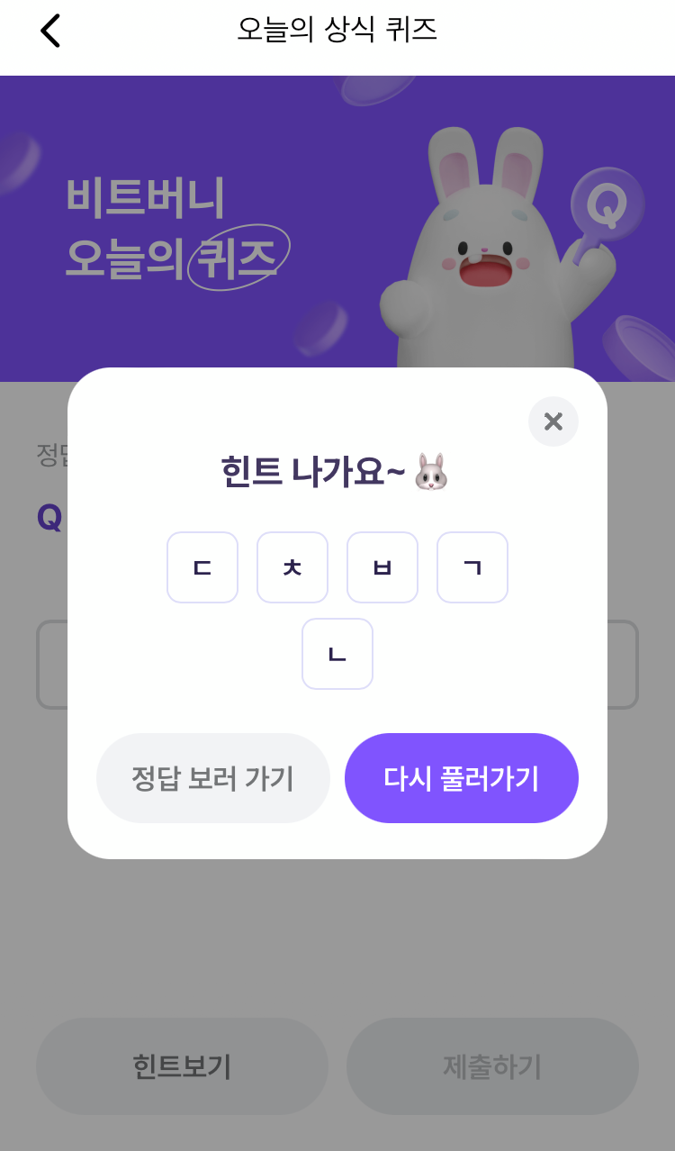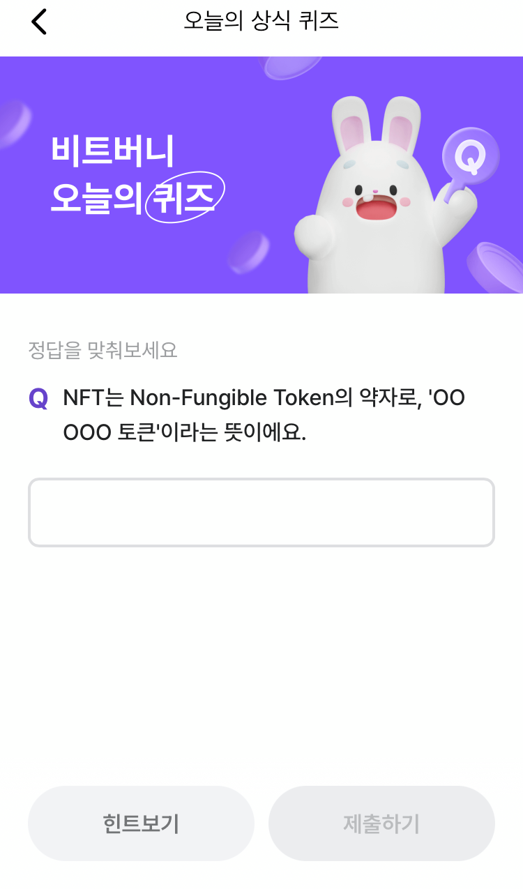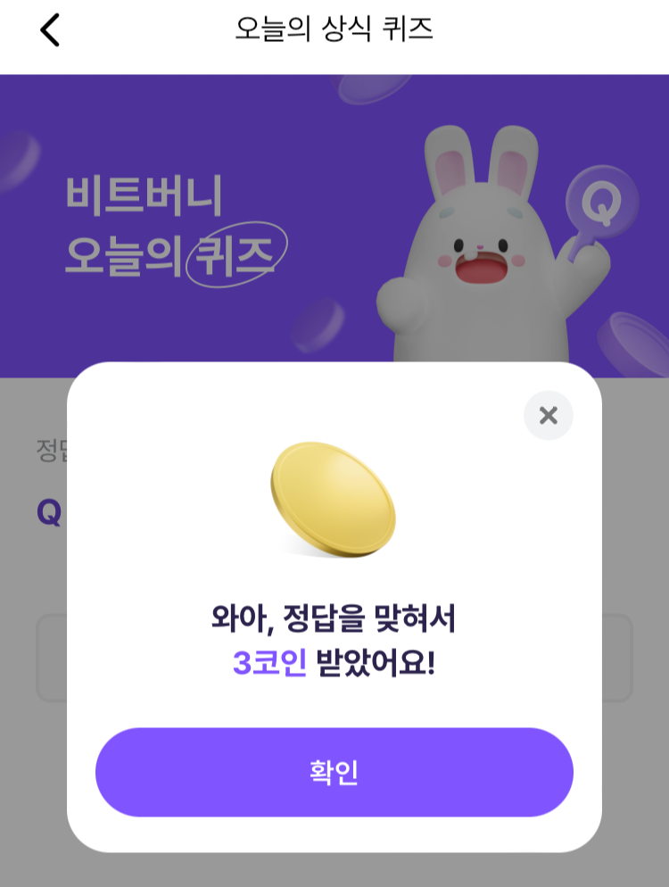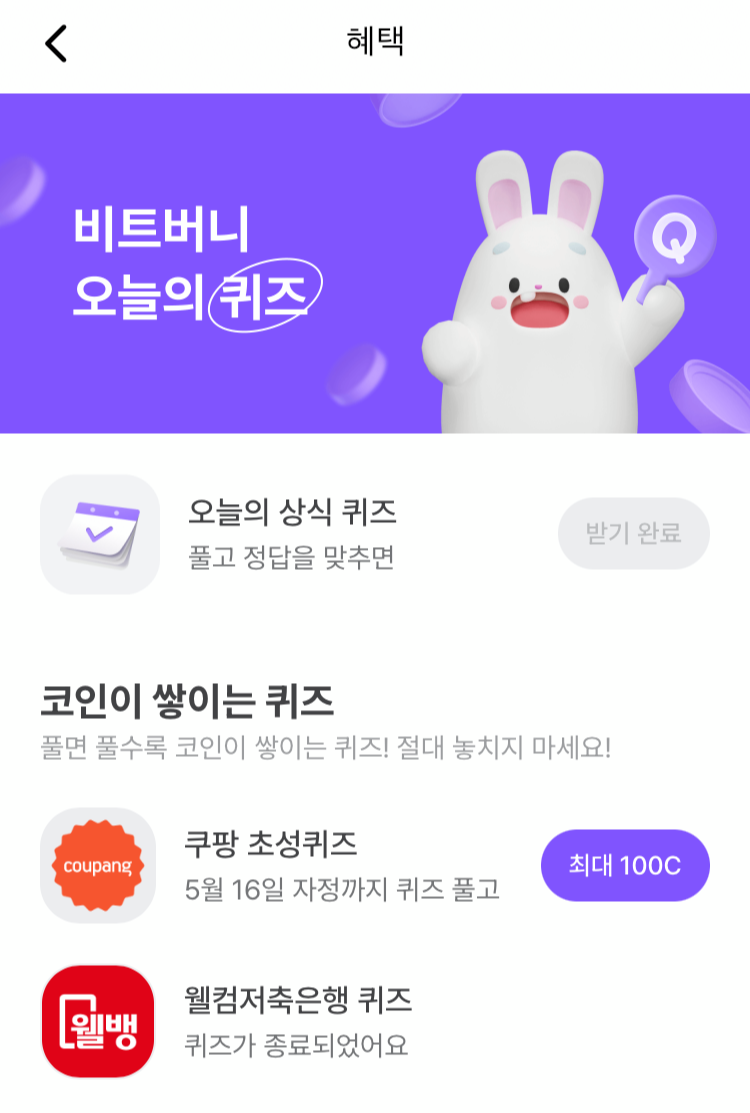 @ 비트버니 퀴즈는 오늘의 퀴즈와 시간대 별로 풀 수 있는 코인이 쌓이는 퀴즈 가 있어요!!