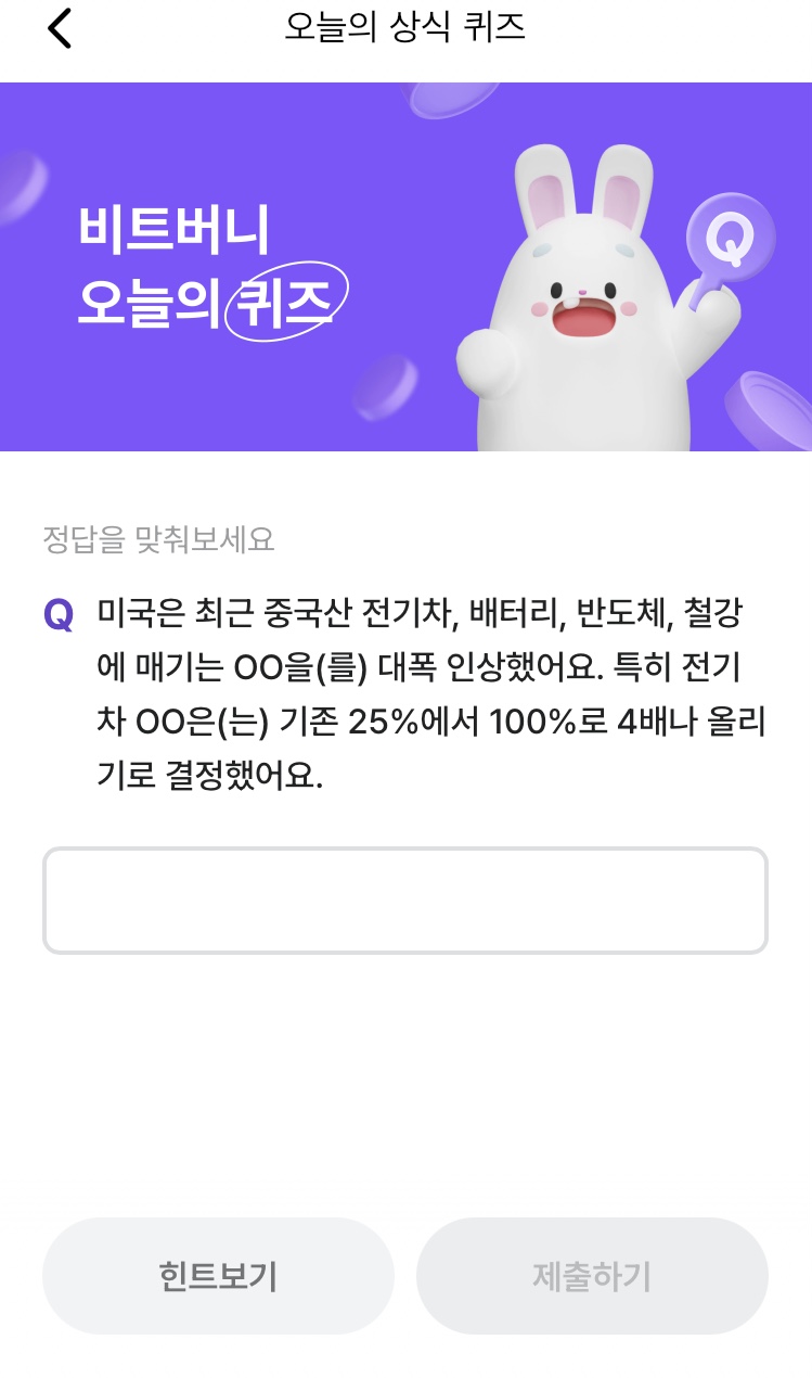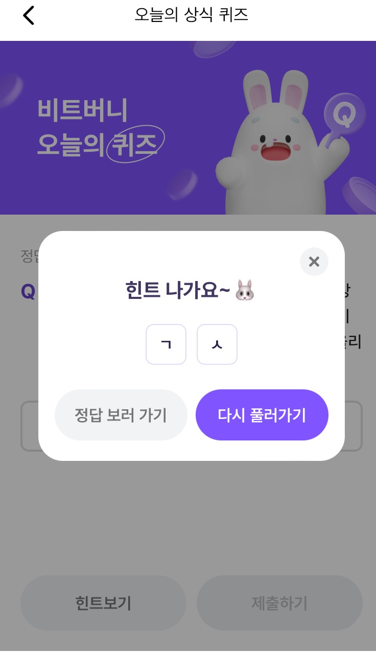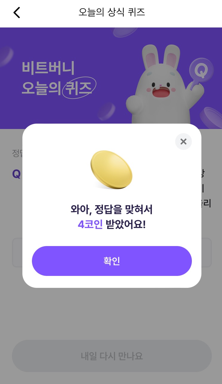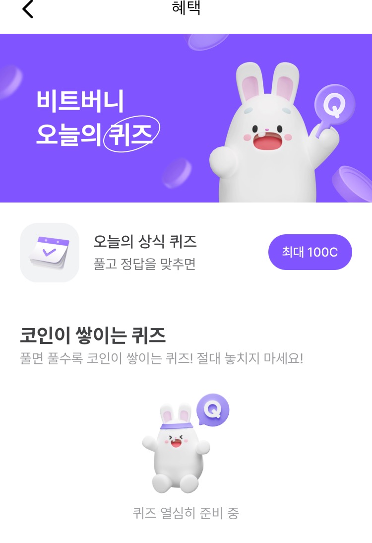 @ 비트버니 퀴즈는 오늘의 퀴즈와 시간대 별로 풀 수 있는 코인이 쌓이는 퀴즈 가 있어요!!