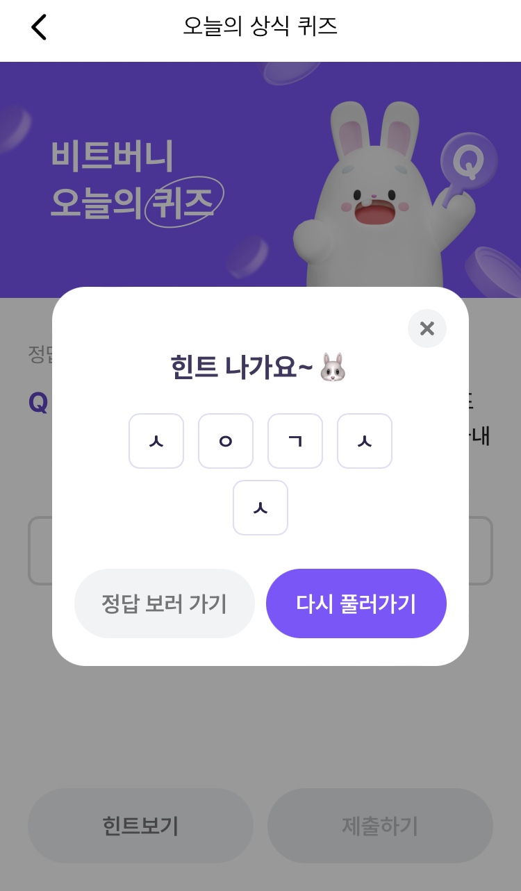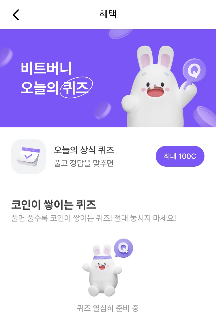 * 비트버니 퀴즈는 오늘의 퀴즈와 코인이 쌓이는 퀴즈가 있어요!!