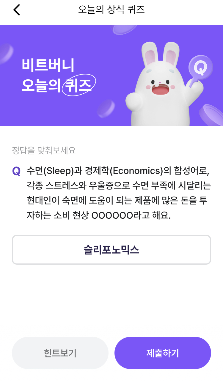 * 비트버니 퀴즈는 오늘의 퀴즈와 코인이 쌓이는 퀴즈가 있어요!!