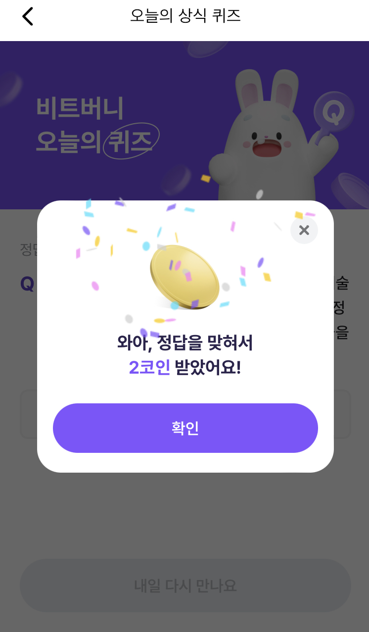 * 비트버니 퀴즈는 오늘의 퀴즈와 코인이 쌓이는 퀴즈가 있어요!!