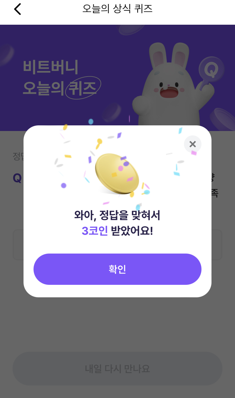 * 비트버니 퀴즈는 오늘의 퀴즈와 코인이 쌓이는 퀴즈가 있어요!!