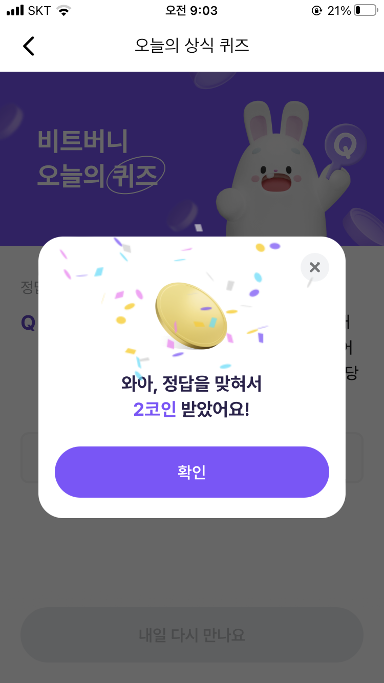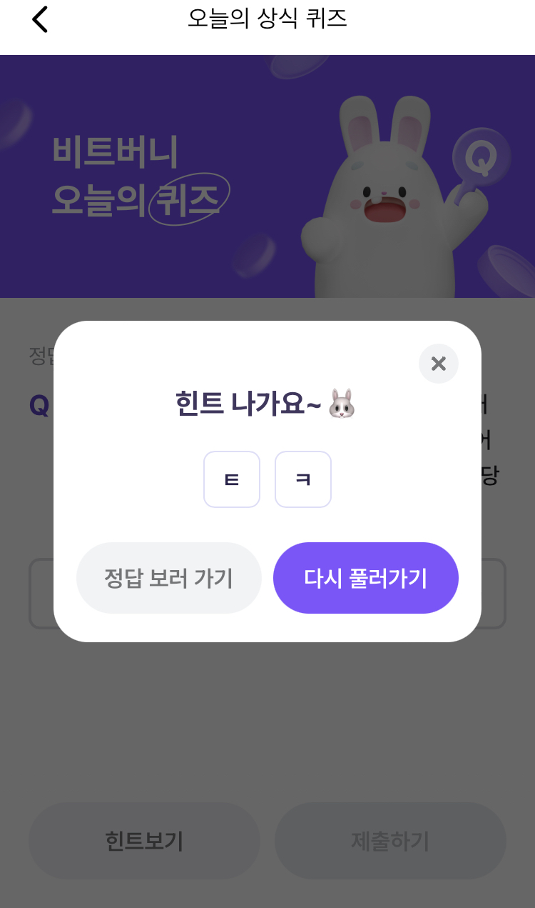 * 비트버니 퀴즈는 오늘의 퀴즈와 코인이 쌓이는 퀴즈가 있어요!!