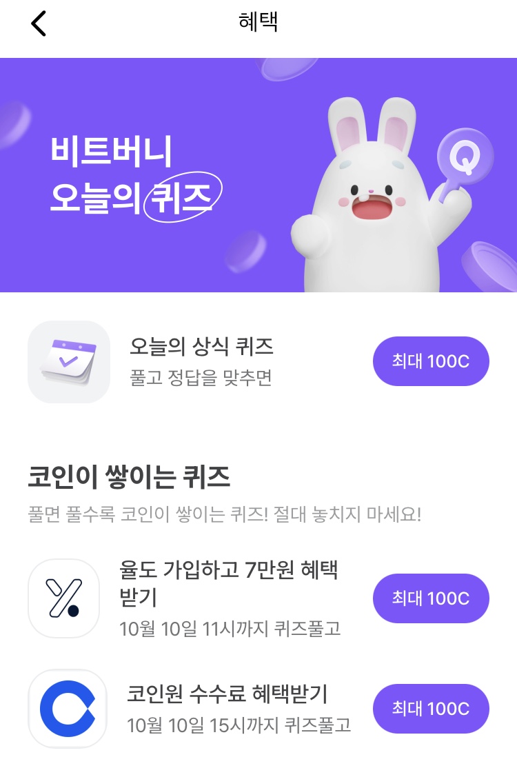 * 비트버니 퀴즈는 오늘의 퀴즈와 코인이 쌓이는 퀴즈가 있어요!!