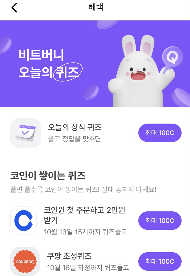 * 비트버니 퀴즈는 오늘의 퀴즈와 코인이 쌓이는 퀴즈가 있어요!!