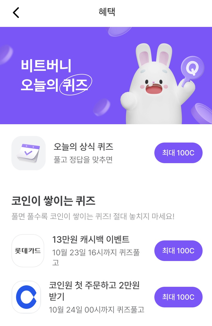 * 비트버니 퀴즈는 오늘의 퀴즈와 코인이 쌓이는 퀴즈가 있어요!!
