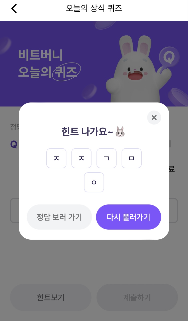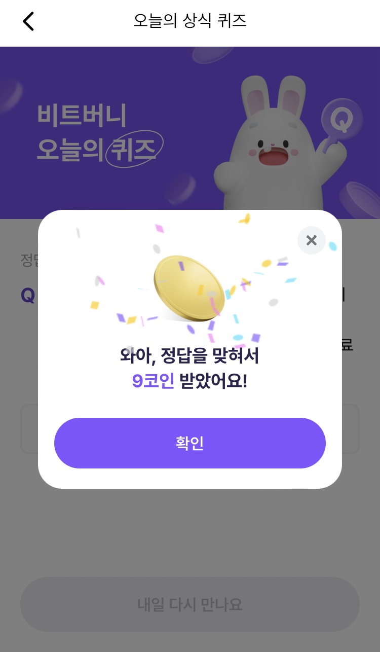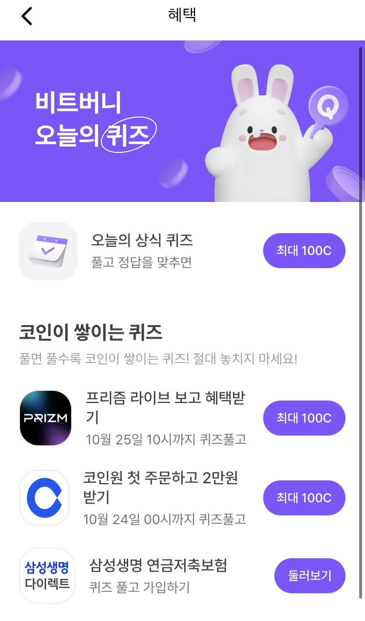 * 비트버니 퀴즈는 오늘의 퀴즈와 코인이 쌓이는 퀴즈가 있어요!!