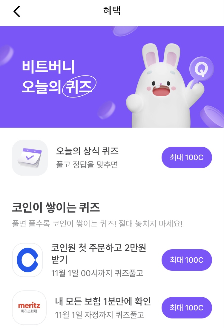 * 비트버니 퀴즈는 오늘의 퀴즈와 코인이 쌓이는 퀴즈가 있어요!!