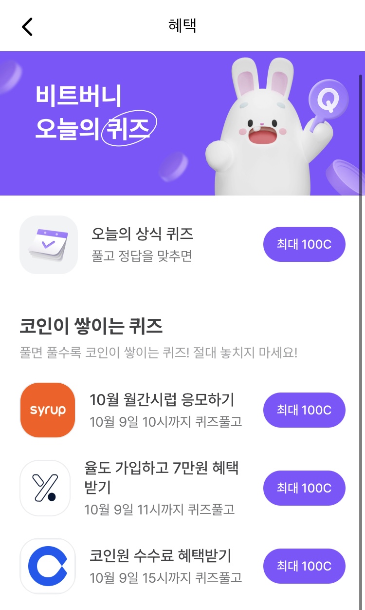 * 비트버니 퀴즈는 오늘의 퀴즈와 코인이 쌓이는 퀴즈가 있어요!!