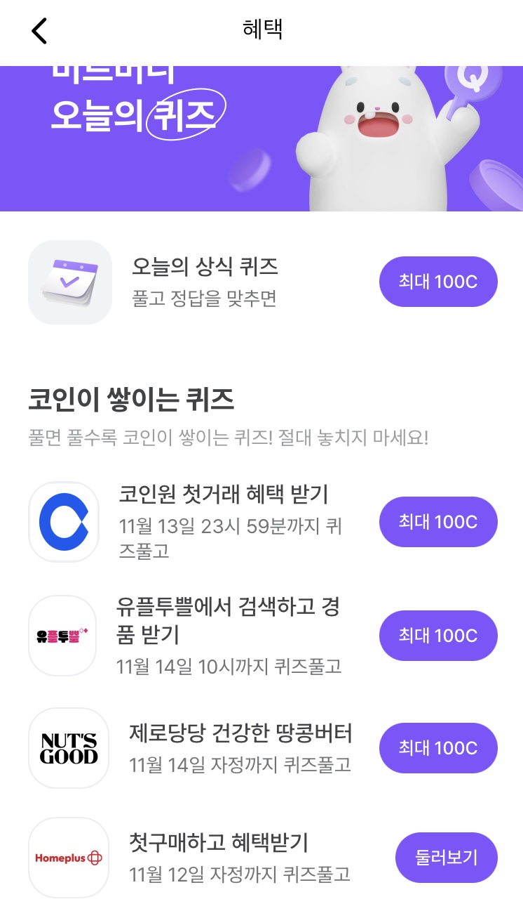 비트버니 11월 13일 오늘의 퀴즈 정답 ㅊㅇㄱㄹ 은?(ft.코인이 쌓이는 퀴즈,코인원,LG유플러스,너츠굿,홈플러스)