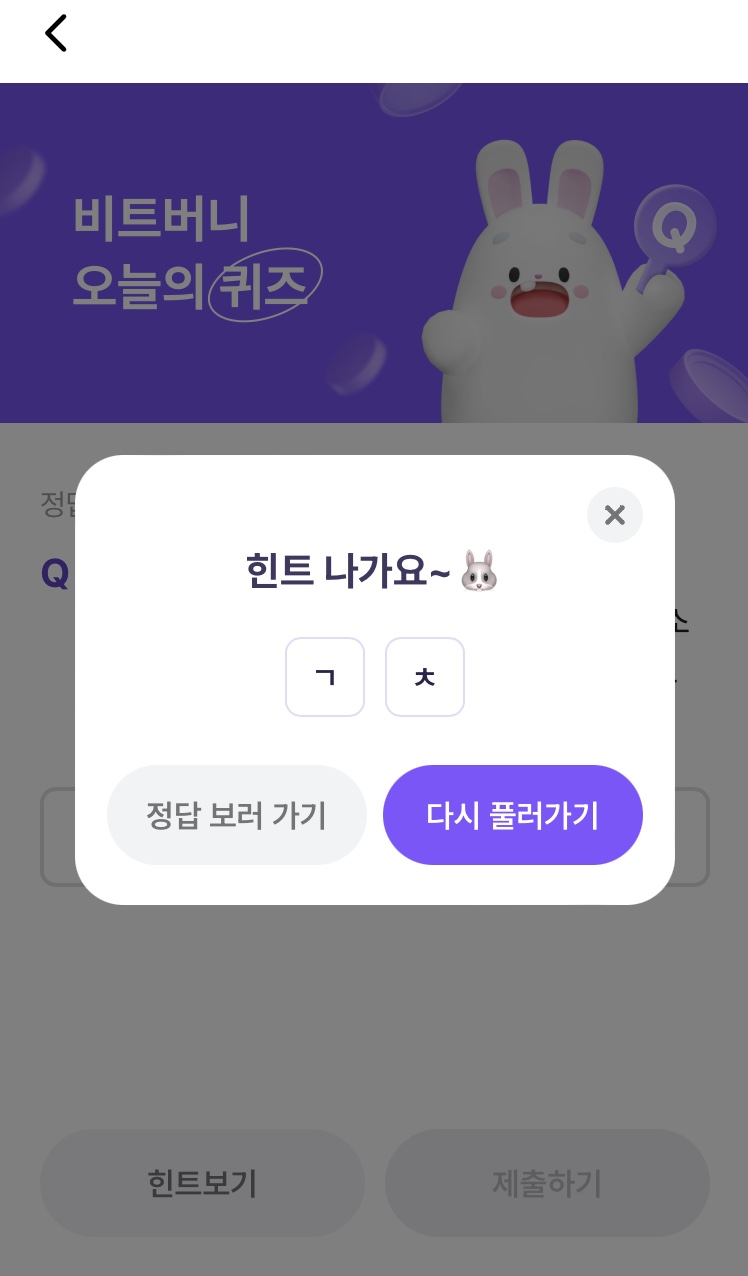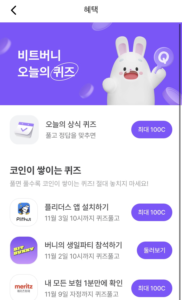 * 비트버니 퀴즈는 오늘의 퀴즈와 코인이 쌓이는 퀴즈가 있어요!!