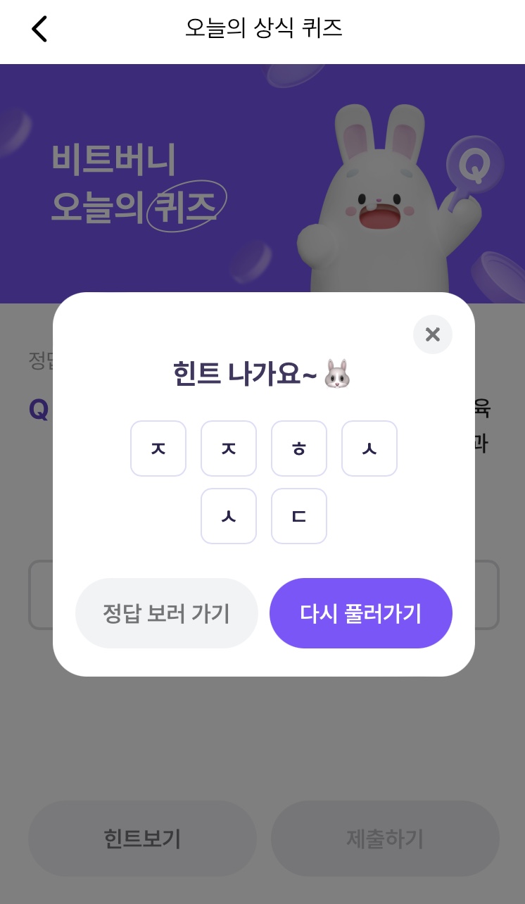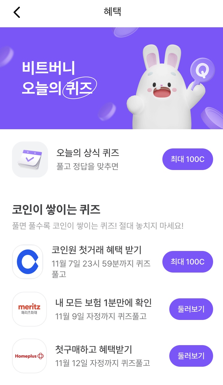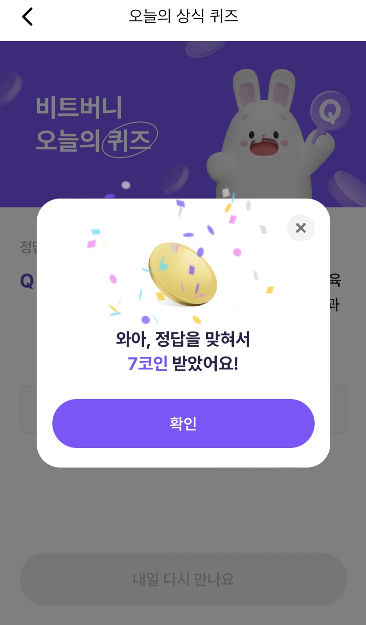 * 비트버니 퀴즈는 오늘의 퀴즈와 코인이 쌓이는 퀴즈가 있어요!!