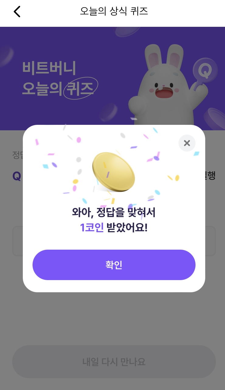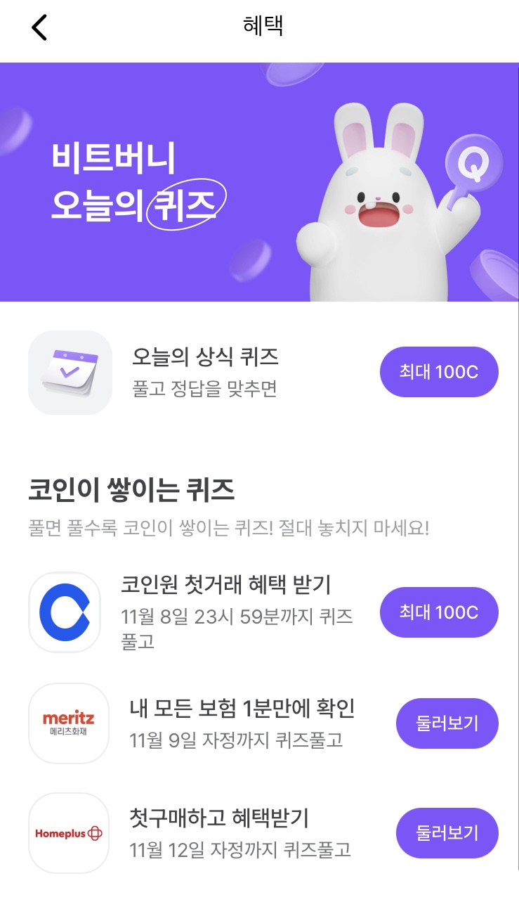 * 비트버니 퀴즈는 오늘의 퀴즈와 코인이 쌓이는 퀴즈가 있어요!!