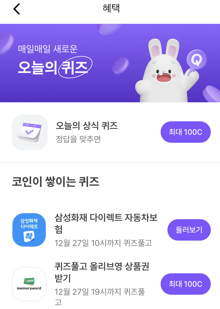 비트버니 12월 27일 오늘의 퀴즈 정답 ㄱㅇㄱㄱ은?(ft. 코인이 쌓이는 퀴즈,삼성화재 다이렉트, 메모리월드)
