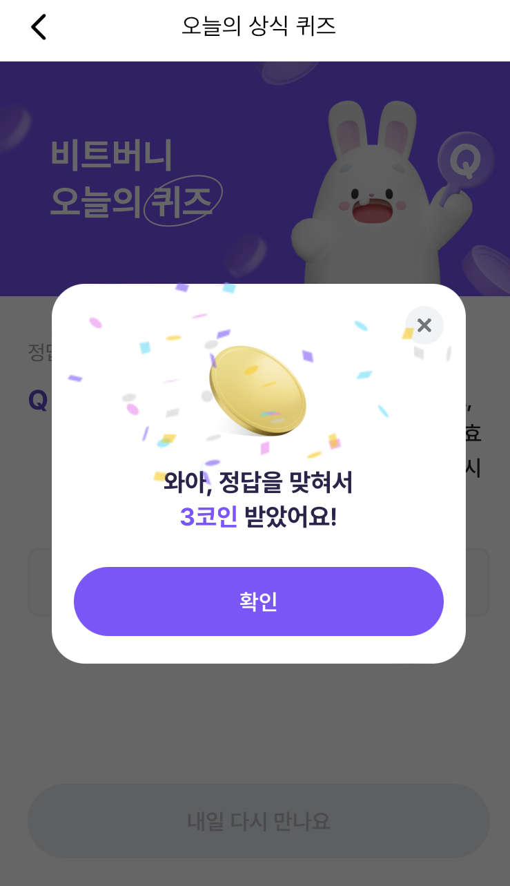 * 비트버니 퀴즈는 오늘의 퀴즈와 코인이 쌓이는 퀴즈가 있어요!!