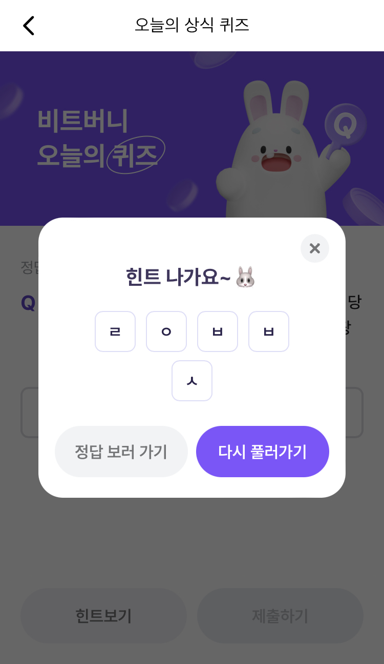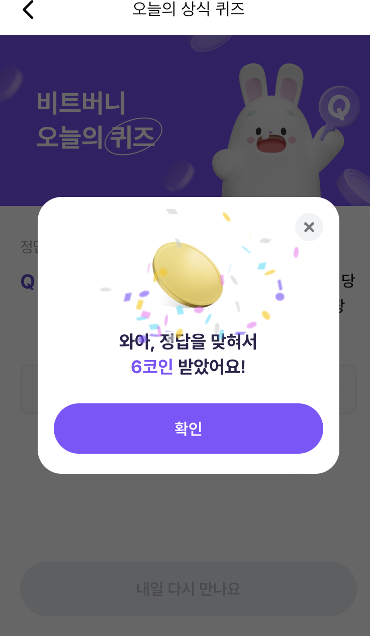 * 비트버니 퀴즈는 오늘의 퀴즈와 코인이 쌓이는 퀴즈가 있어요!!