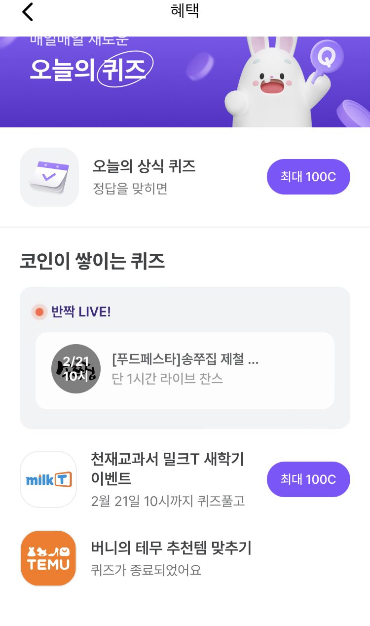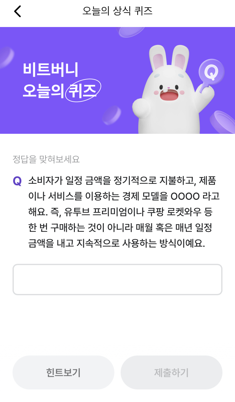 * 비트버니 퀴즈는 오늘의 퀴즈와 코인이 쌓이는 퀴즈가 있어요!!