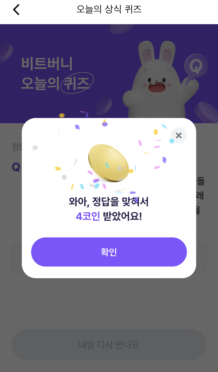 * 비트버니 퀴즈는 오늘의 퀴즈와 코인이 쌓이는 퀴즈가 있어요!!