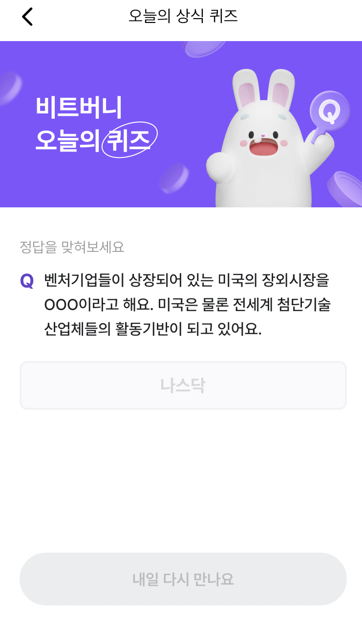* 비트버니 퀴즈는 오늘의 퀴즈와 코인이 쌓이는 퀴즈가 있어요!!