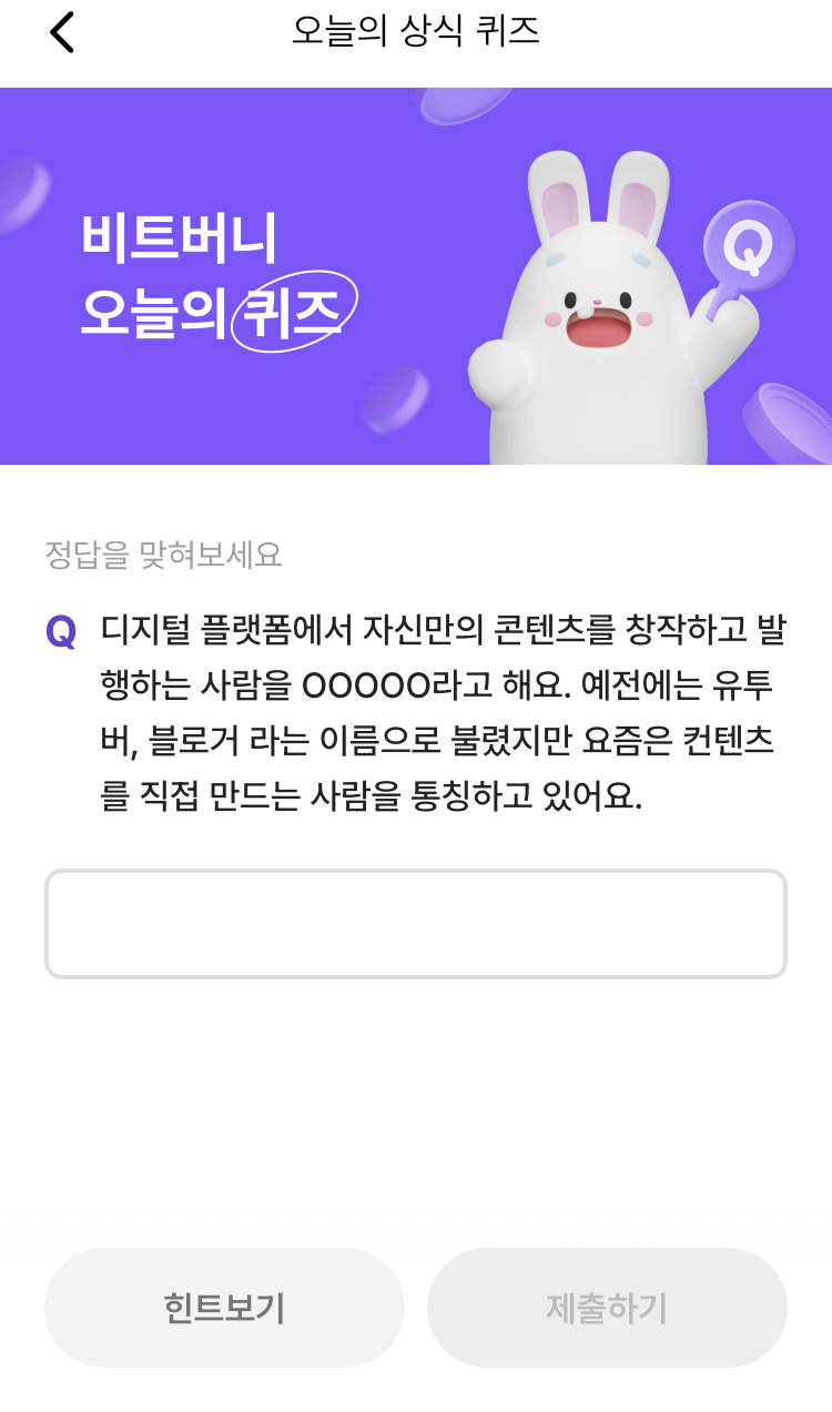 * 비트버니 퀴즈는 오늘의 퀴즈와 코인이 쌓이는 퀴즈가 있어요!!