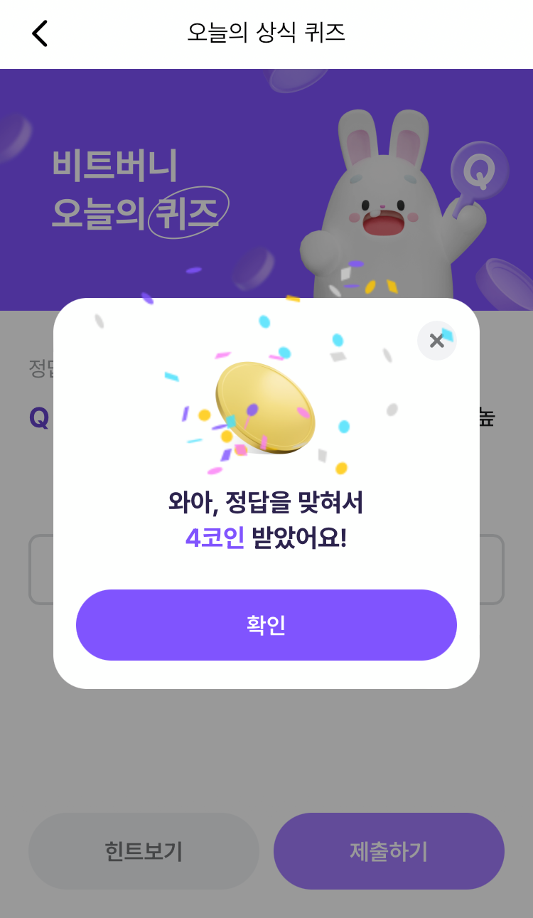 * 비트버니 퀴즈는 오늘의 퀴즈와 코인이 쌓이는 퀴즈가 있어요!!