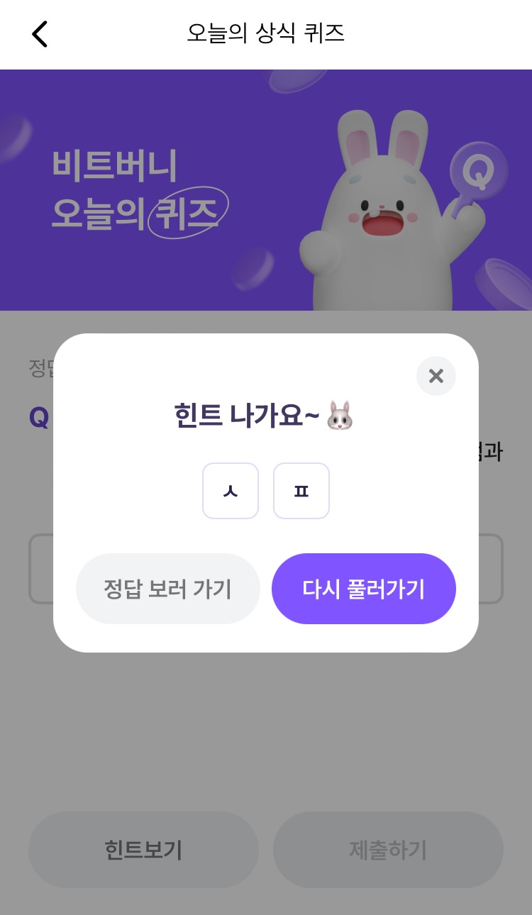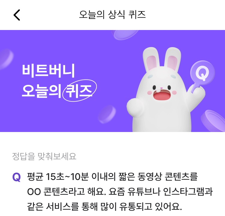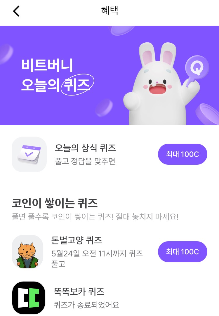 * 비트버니 퀴즈는 오늘의 퀴즈와 코인이 쌓이는 퀴즈가 있어요!!