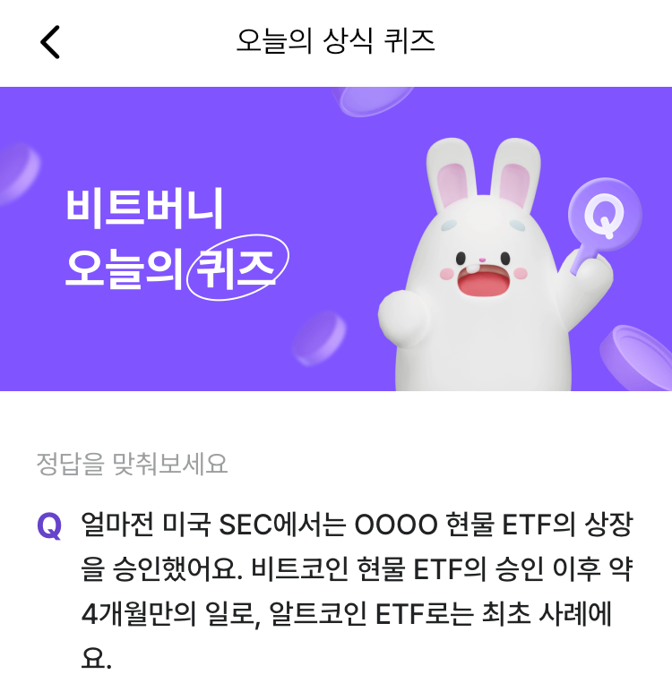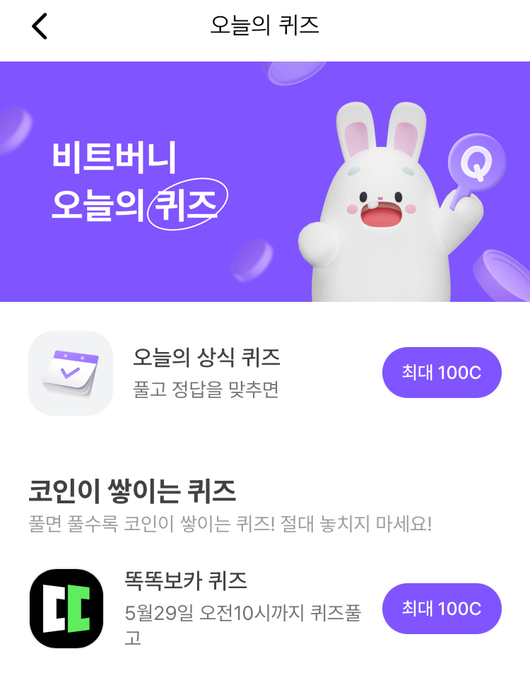 * 비트버니 퀴즈는 오늘의 퀴즈와 코인이 쌓이는 퀴즈가 있어요!!