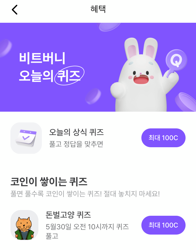 * 비트버니 퀴즈는 오늘의 퀴즈코인이 쌓이는 퀴즈가 있어요!!