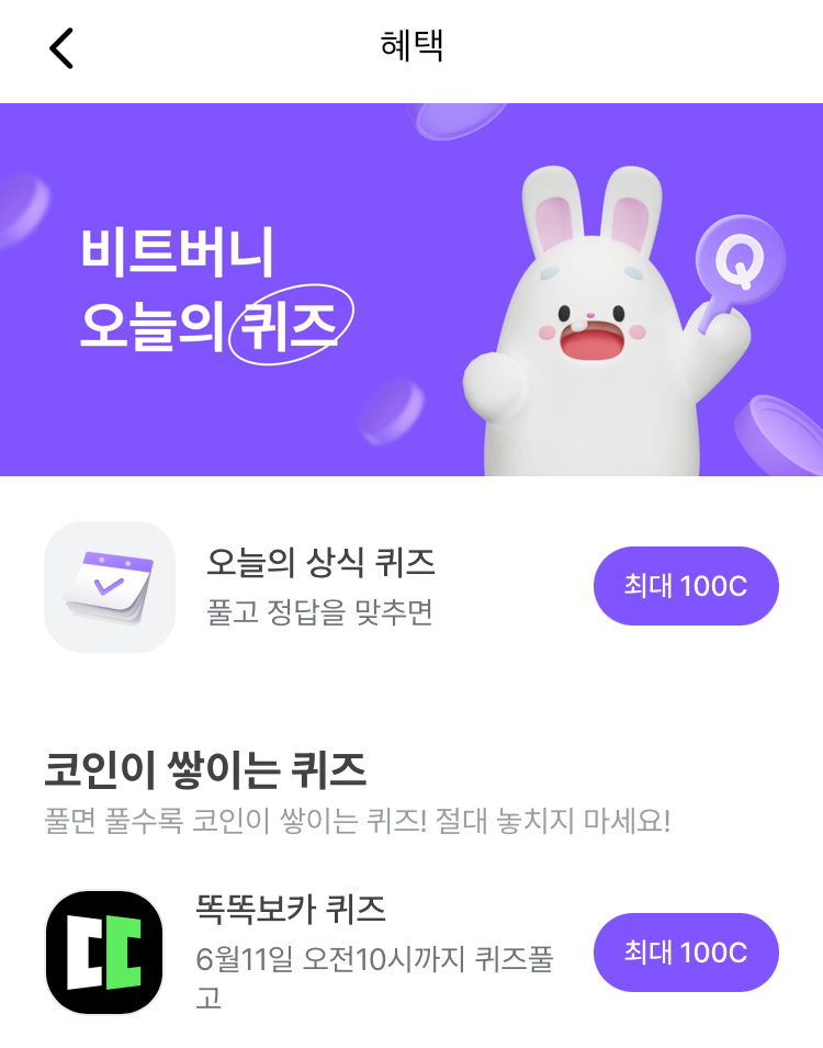 * 비트버니 퀴즈는 오늘의 퀴즈와 코인이 쌓이는 퀴즈가 있어요!!