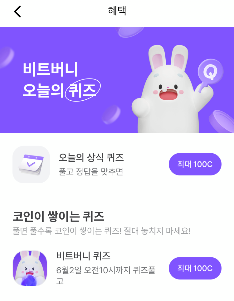 * 비트버니 퀴즈는 오늘의 퀴즈코인이 쌓이는 퀴즈가 있어요!!