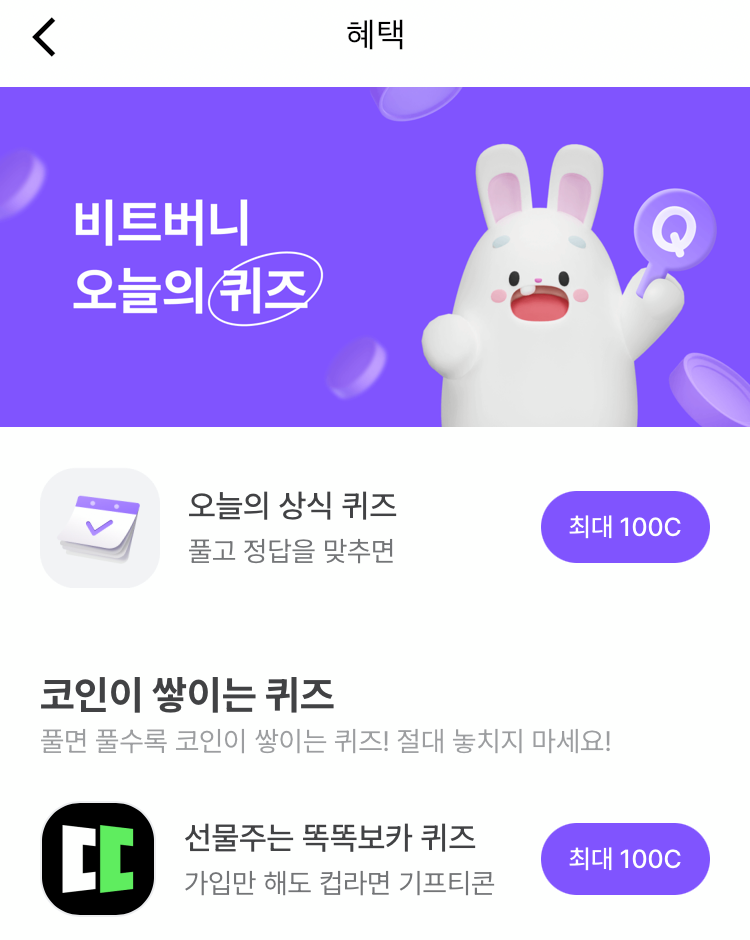 * 비트버니 퀴즈는 오늘의 퀴즈와 코인이 쌓이는 퀴즈가 있어요!!