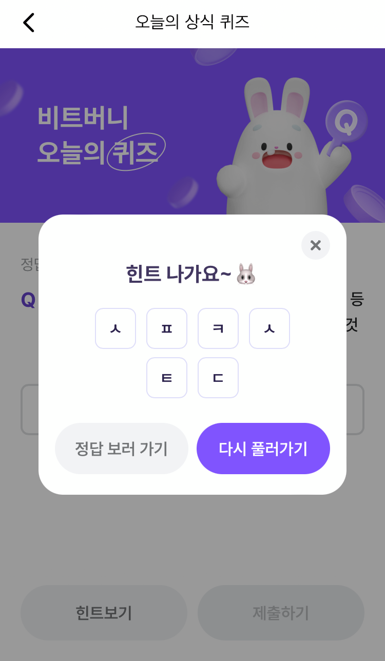 * 비트버니 퀴즈는 오늘의 퀴즈와 코인이 쌓이는 퀴즈가 있어요!!