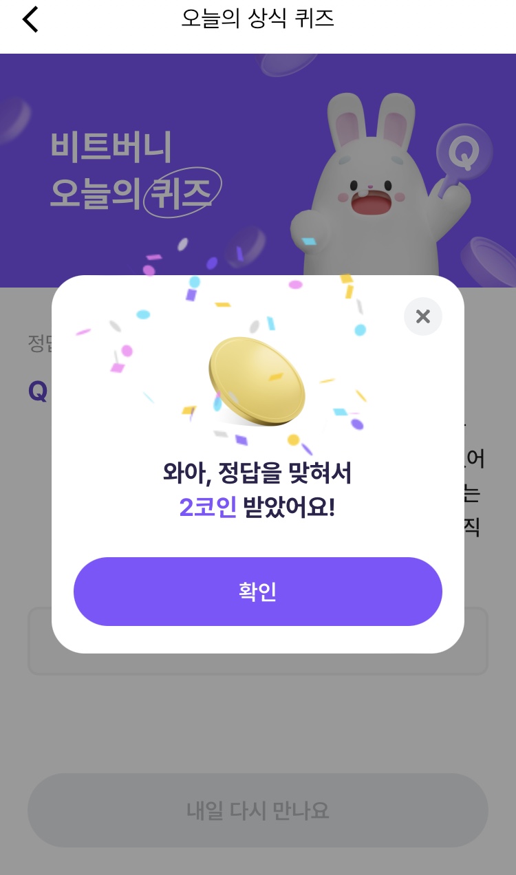 * 비트버니 퀴즈는 오늘의 퀴즈와 코인이 쌓이는 퀴즈가 있어요!!