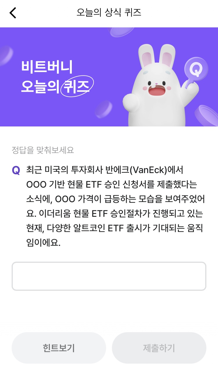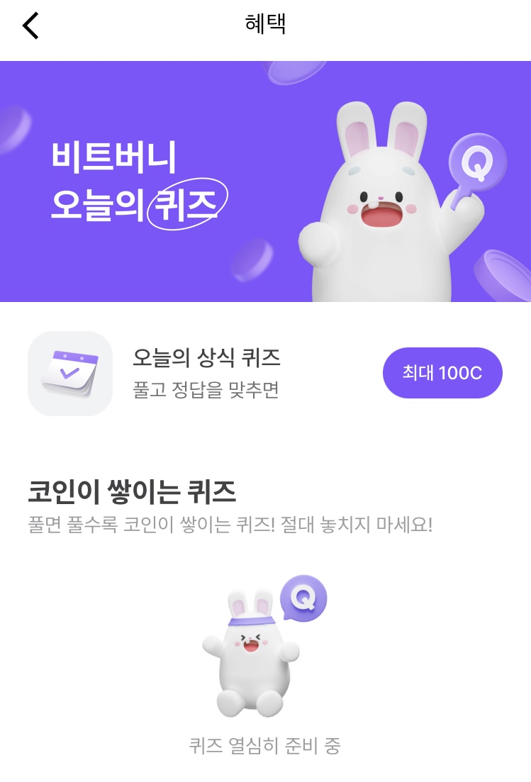 * 비트버니 퀴즈는 오늘의 퀴즈와 코인이 쌓이는 퀴즈가 있어요!!