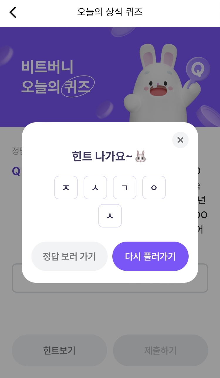 * 비트버니 퀴즈는 오늘의 퀴즈와 코인이 쌓이는 퀴즈가 있어요!!