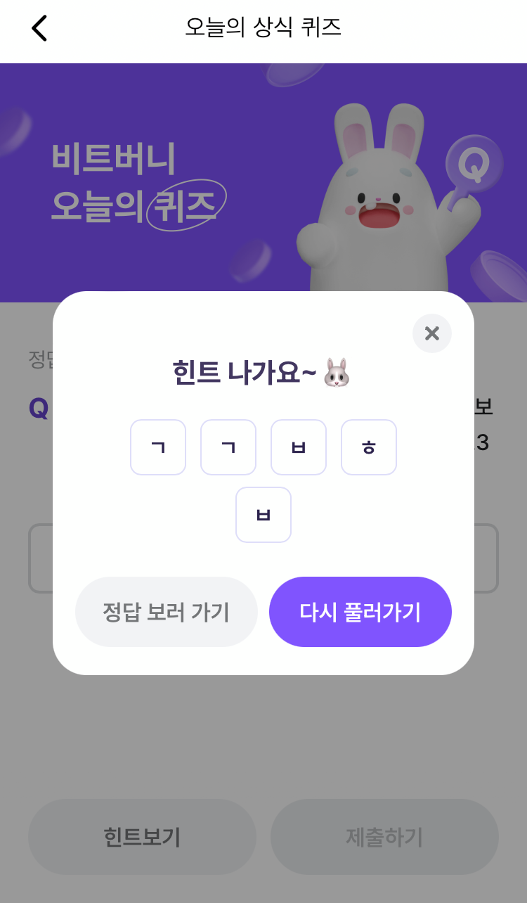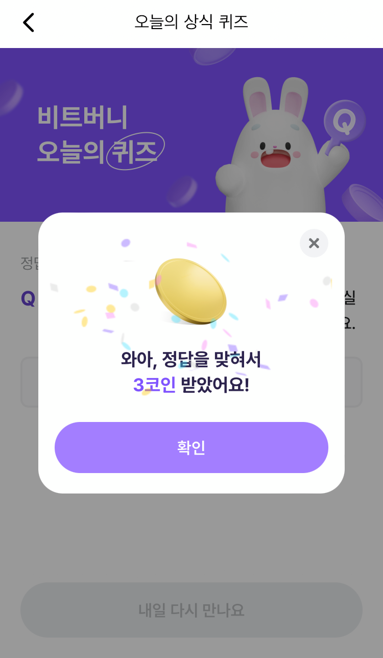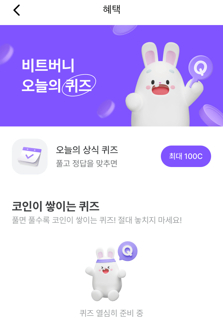 * 비트버니 퀴즈는 오늘의 퀴즈와 코인이 쌓이는 퀴즈가 있어요!!