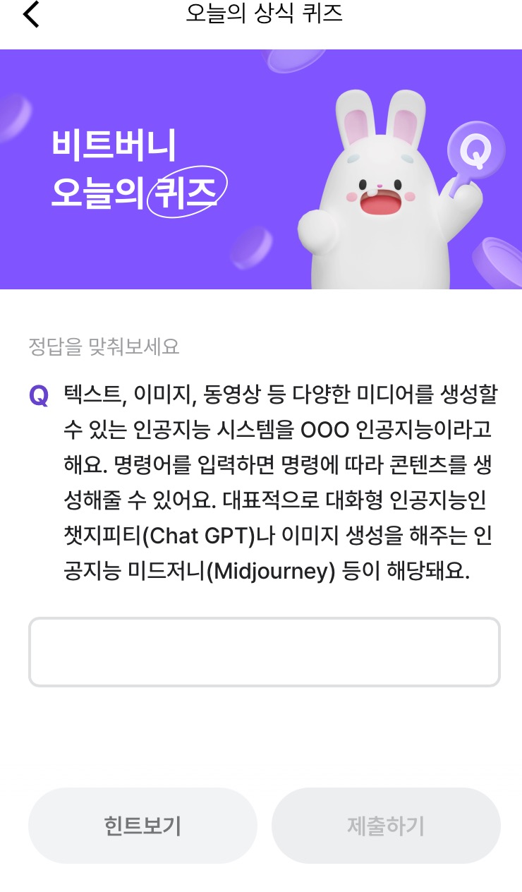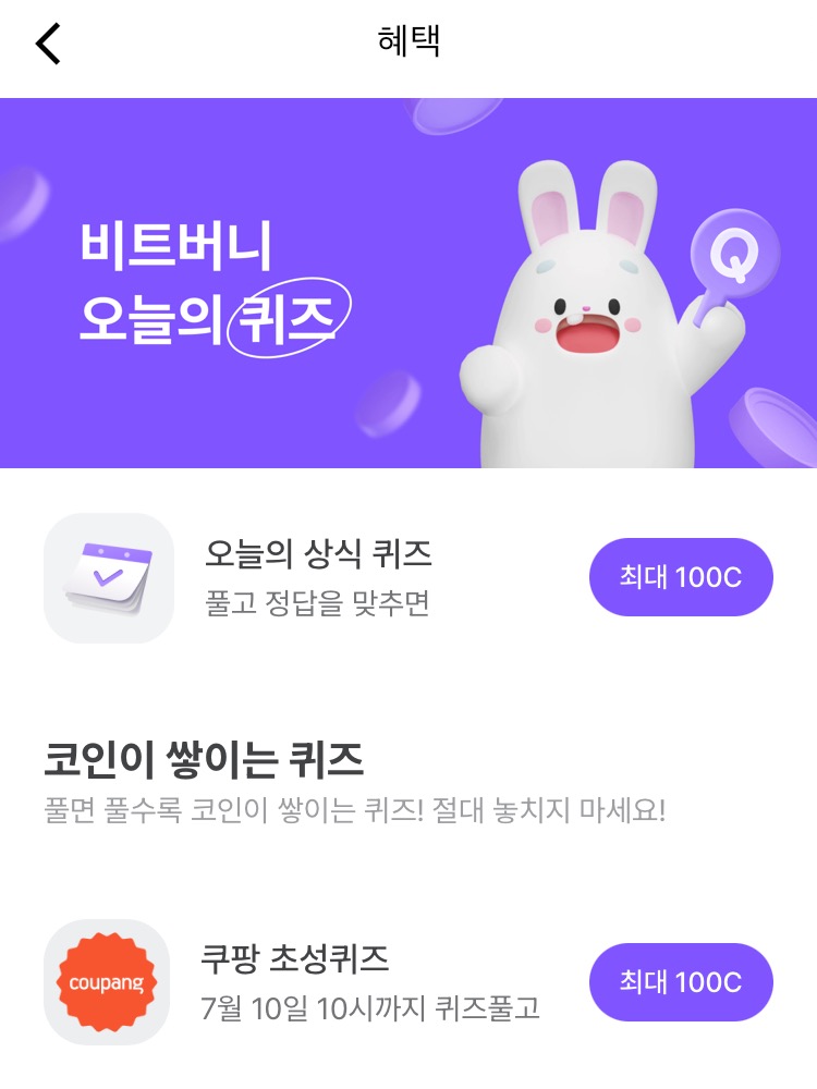 * 비트버니 퀴즈는 오늘의 퀴즈와 코인이 쌓이는 퀴즈가 있어요!!