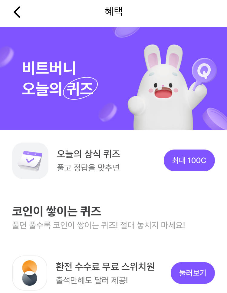 * 비트버니 퀴즈는 오늘의 퀴즈와 코인이 쌓이는 퀴즈가 있어요!!