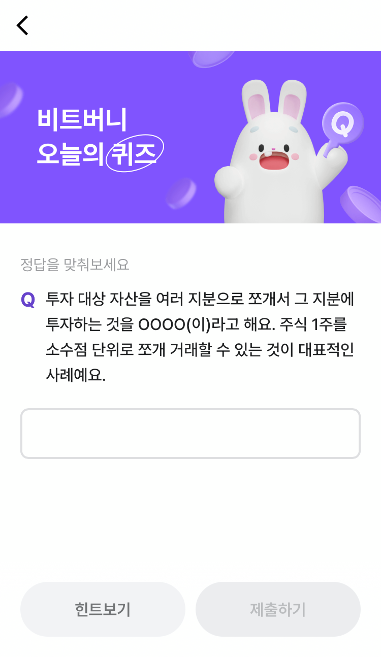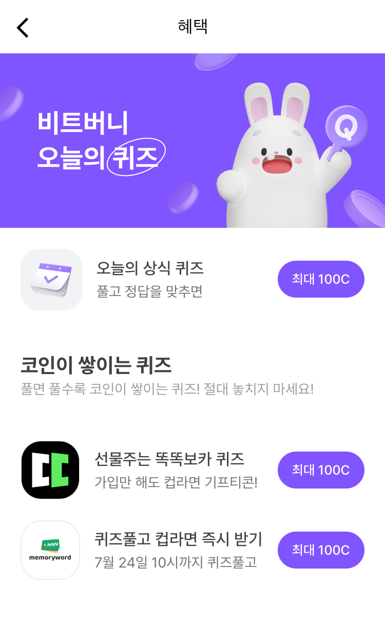 * 비트버니 퀴즈는 오늘의 퀴즈와 코인이 쌓이는 퀴즈가 있어요!!