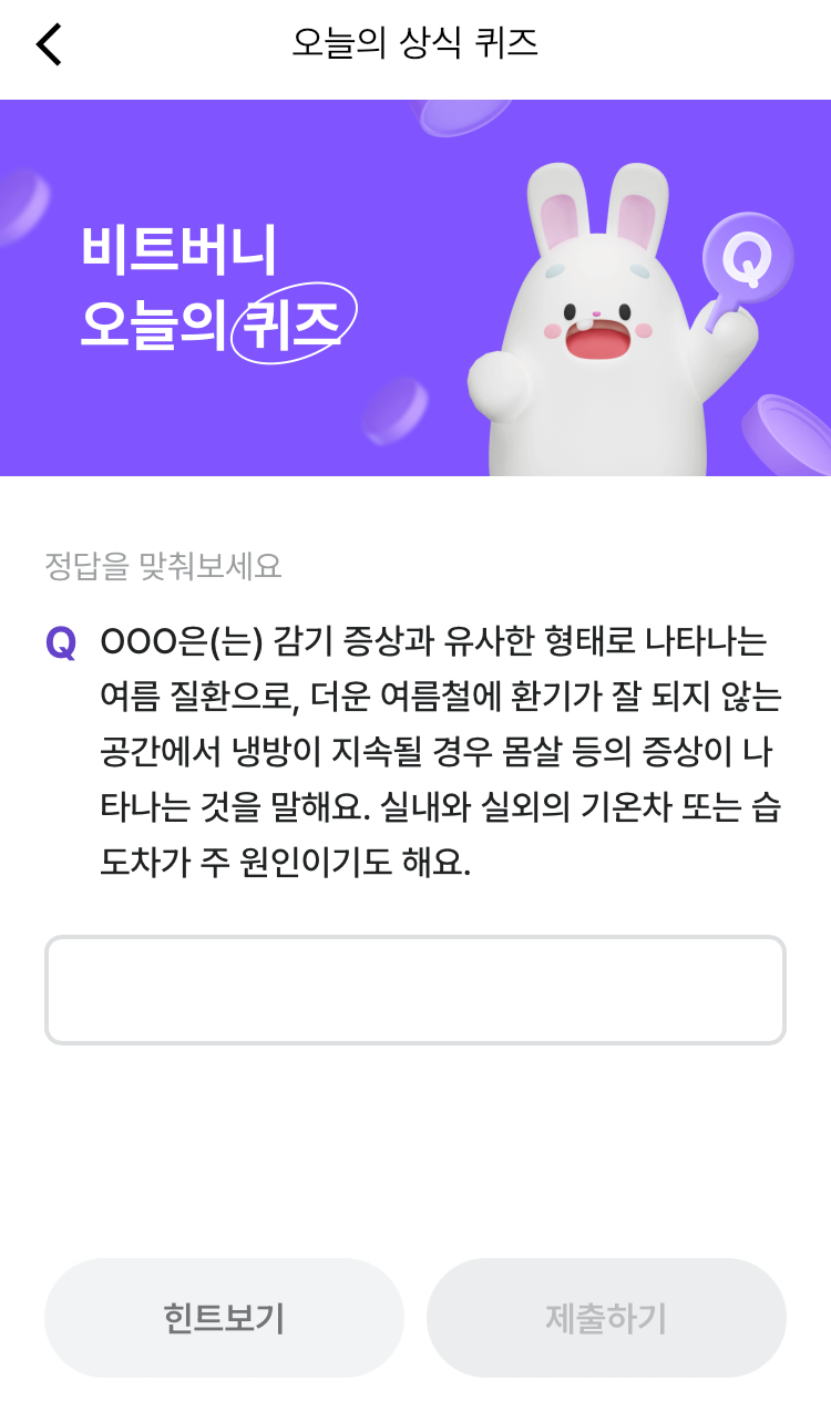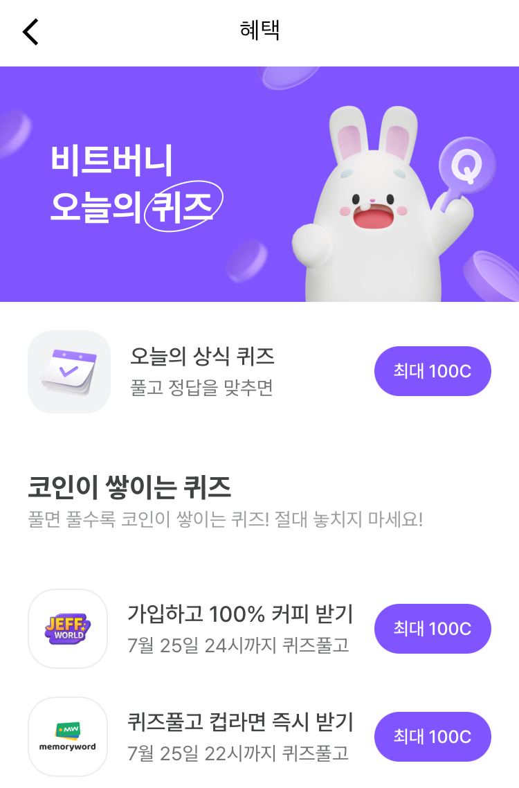 * 비트버니 퀴즈는 오늘의 퀴즈와 코인이 쌓이는 퀴즈가 있어요!!