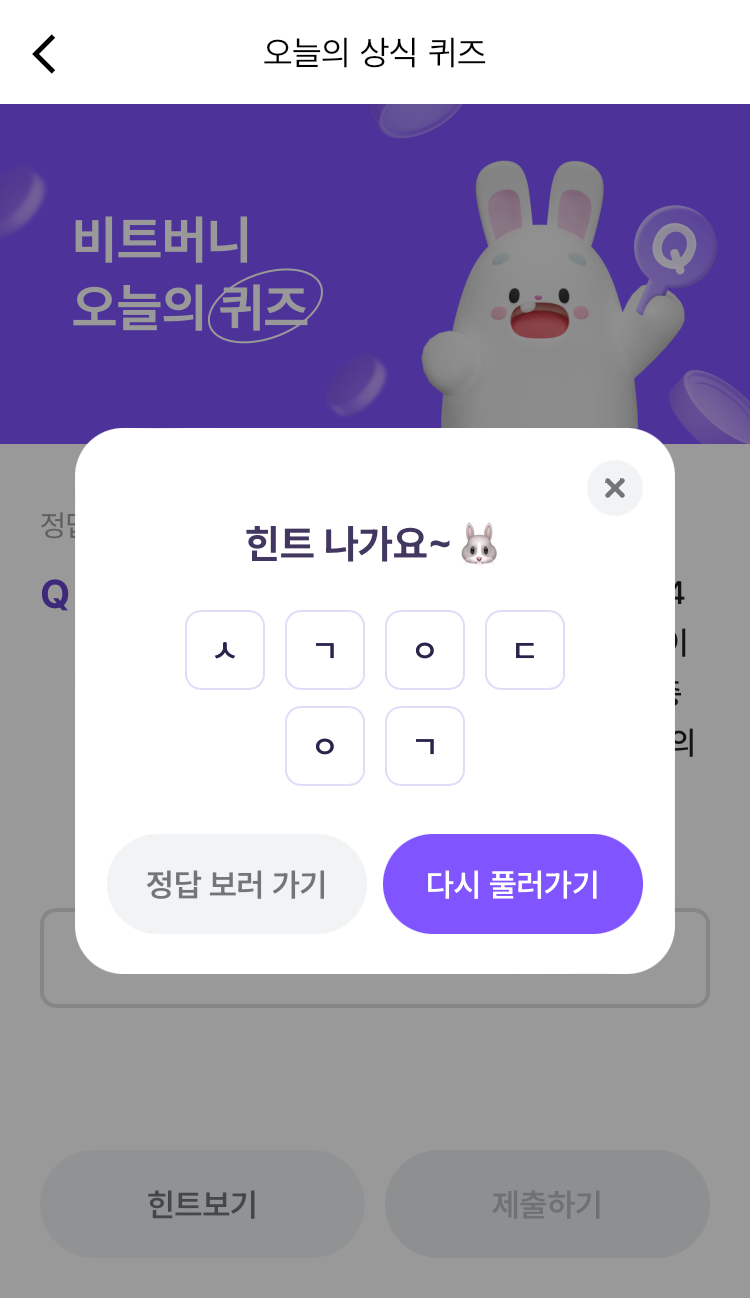 * 비트버니 퀴즈는 오늘의 퀴즈와 코인이 쌓이는 퀴즈가 있어요!!
