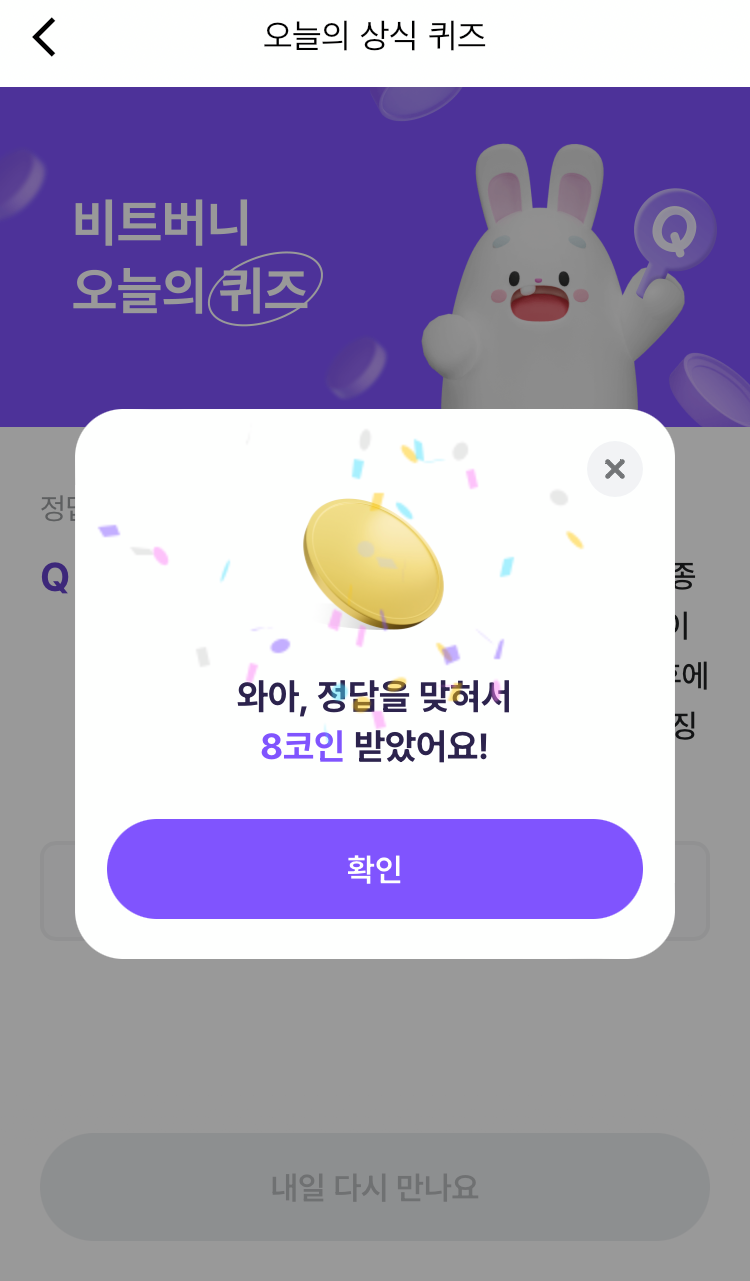 * 비트버니 퀴즈는 오늘의 퀴즈와 코인이 쌓이는 퀴즈가 있어요!!