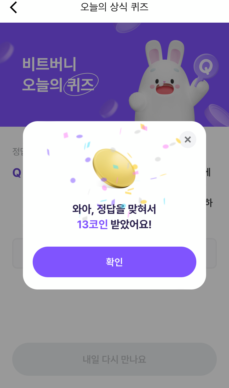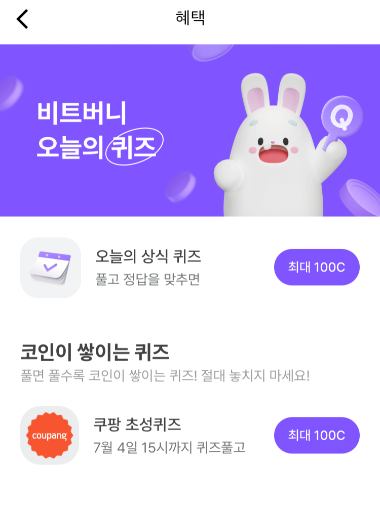 * 비트버니 퀴즈는 오늘의 퀴즈와 코인이 쌓이는 퀴즈가 있어요!!