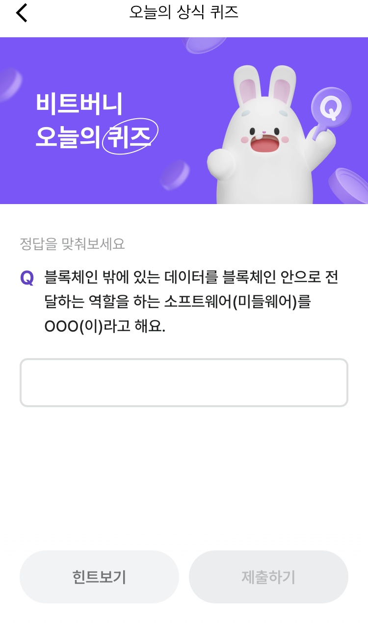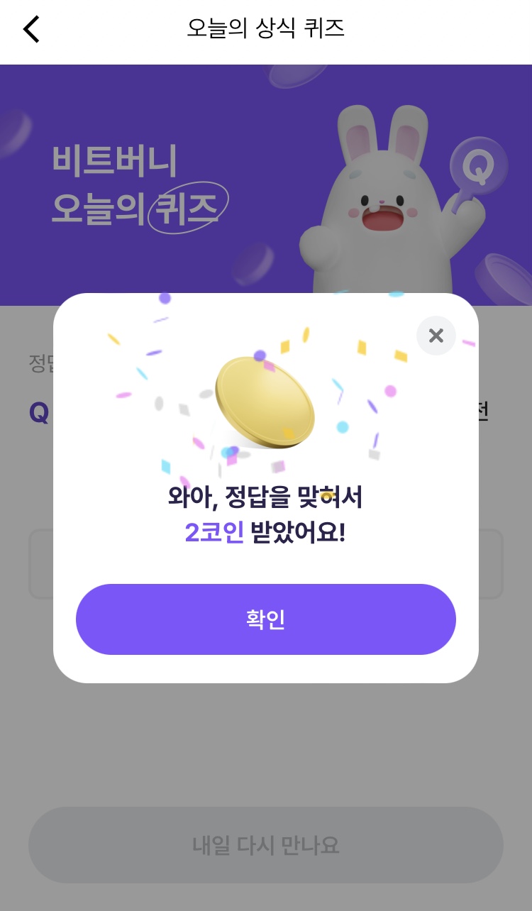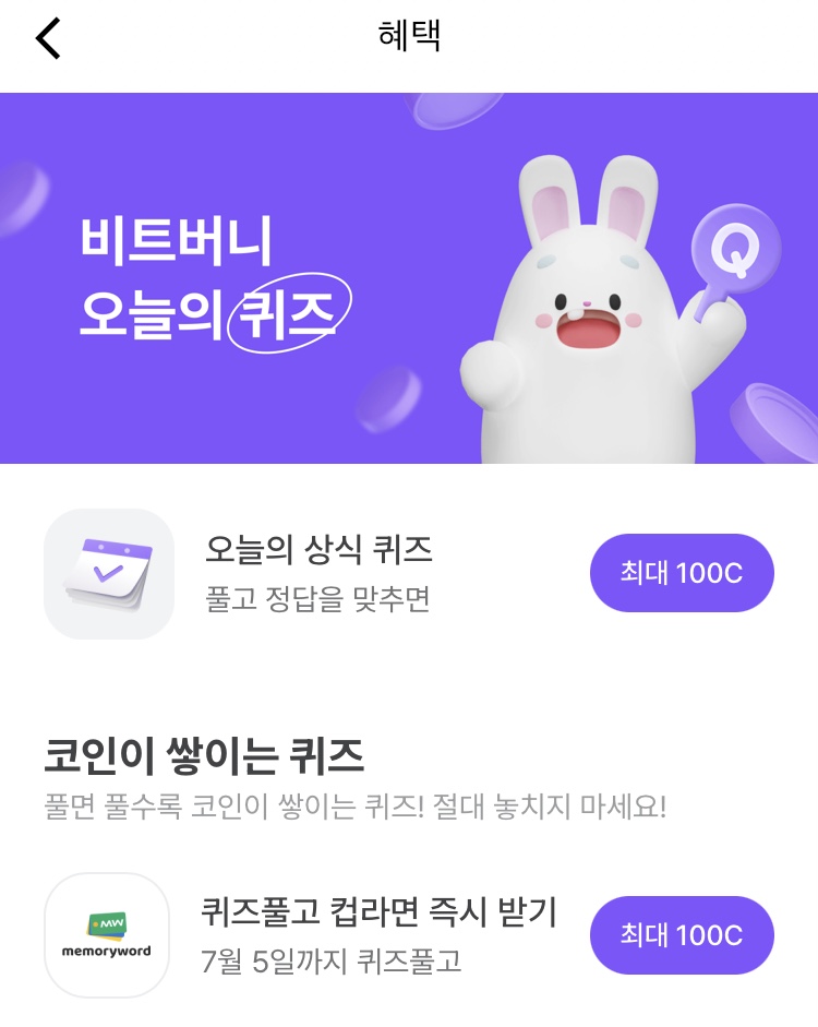 * 비트버니 퀴즈는 오늘의 퀴즈와 코인이 쌓이는 퀴즈가 있어요!!