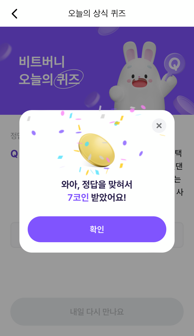 * 비트버니 퀴즈는 오늘의 퀴즈와 코인이 쌓이는 퀴즈가 있어요!!